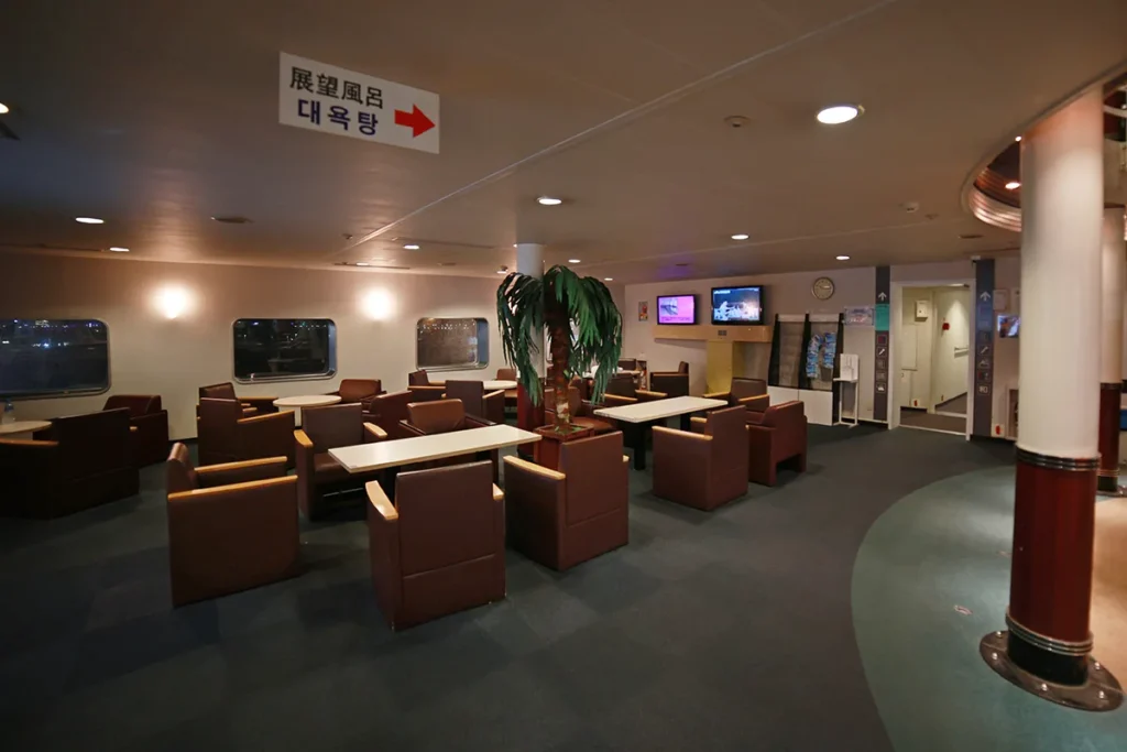 뉴카멜리아호에 탑승하자마자 마주하게 되는 3층 안내 데스크(인포메이션) 앞 로비는 선내에서 가장 넓고 쾌적한 공용 공간입니다. 통창을 통해 시시각각 변하는 부산항의 전경을 한눈에 담을 수 있어 항상 인기있는 자리입니다.